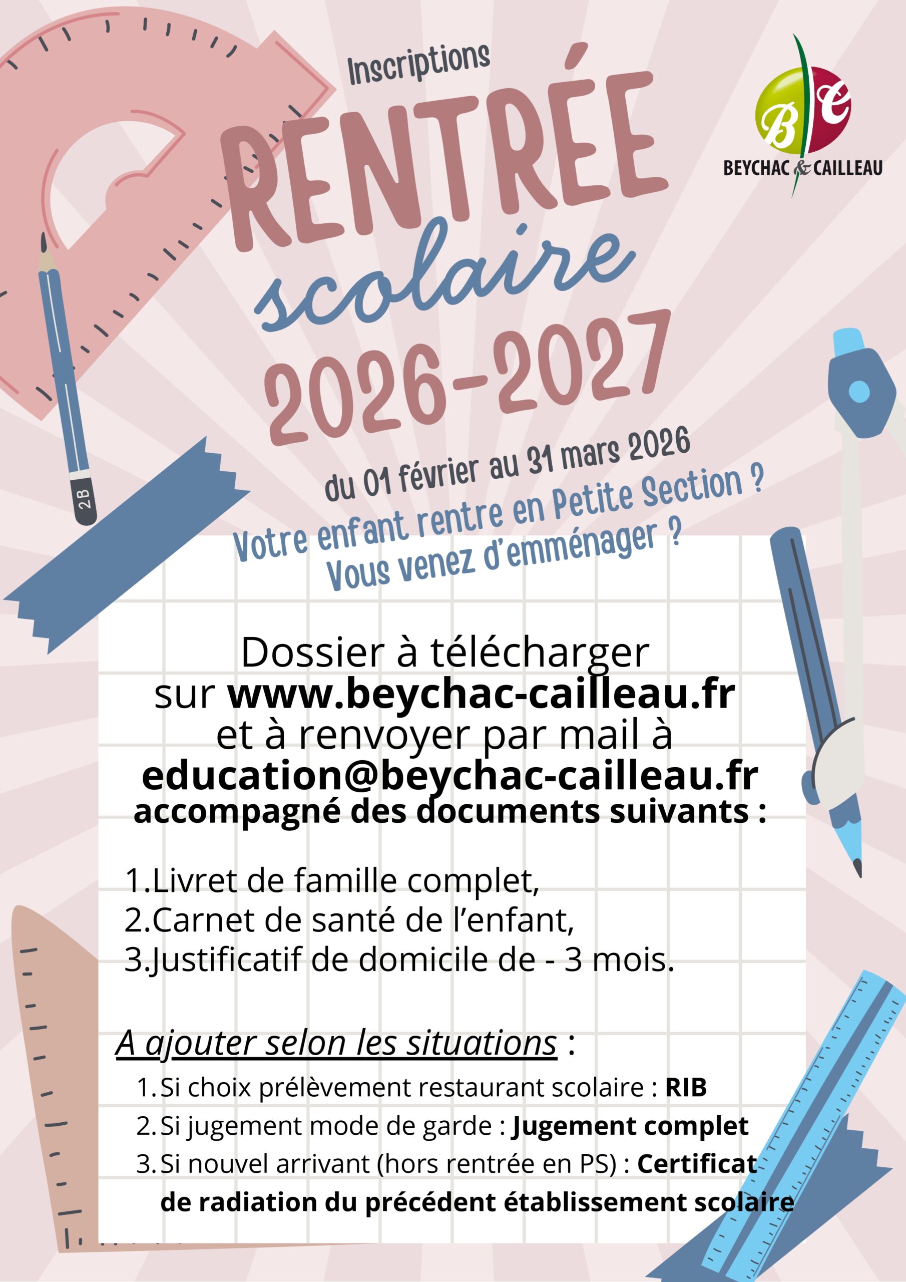 • Les inscriptions pour la rentrée scolaire 2026/2027, sont à transmettre par mail à education@beychac-cailleau.fr avant le 31 mars 2026.
