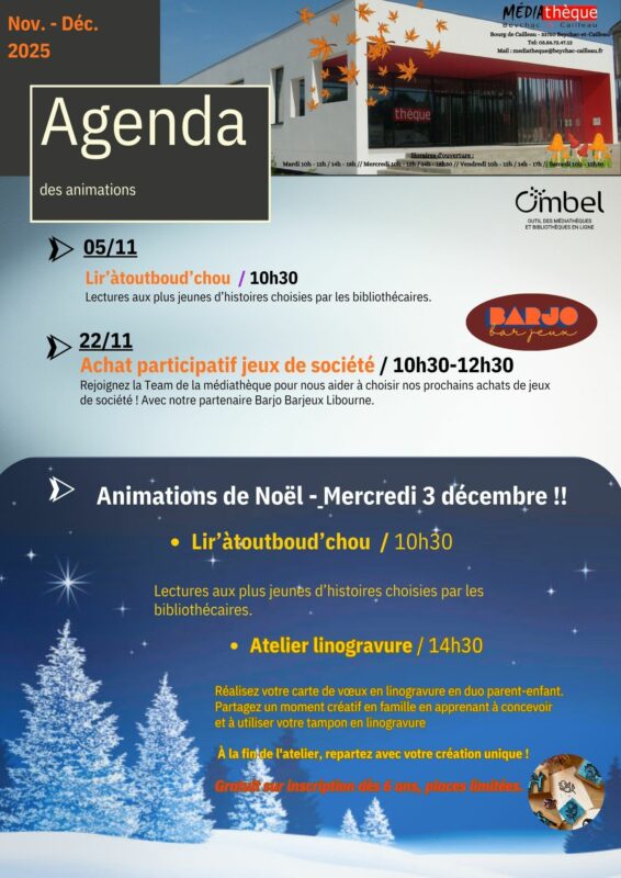 Agenda médiathèque Novembre-Décembre Date : samedi 1 novembre - jeudi 4 décembre Heure : 00h00 Cet événement vous intéresse ? partagez-le : Nos autres événements Programme T.U.G. lundi 1 septembre - samedi 31 janvier Agenda médiathèque Novembre-Décembre samedi 1 novembre - jeudi 4 décembre Commémoration de l'Armistice du 11 novembre 1918 mardi 11 novembre Le marché de Noël dimanche 30 novembre Lir'àtoutboud'chou mercredi 3 décembre
