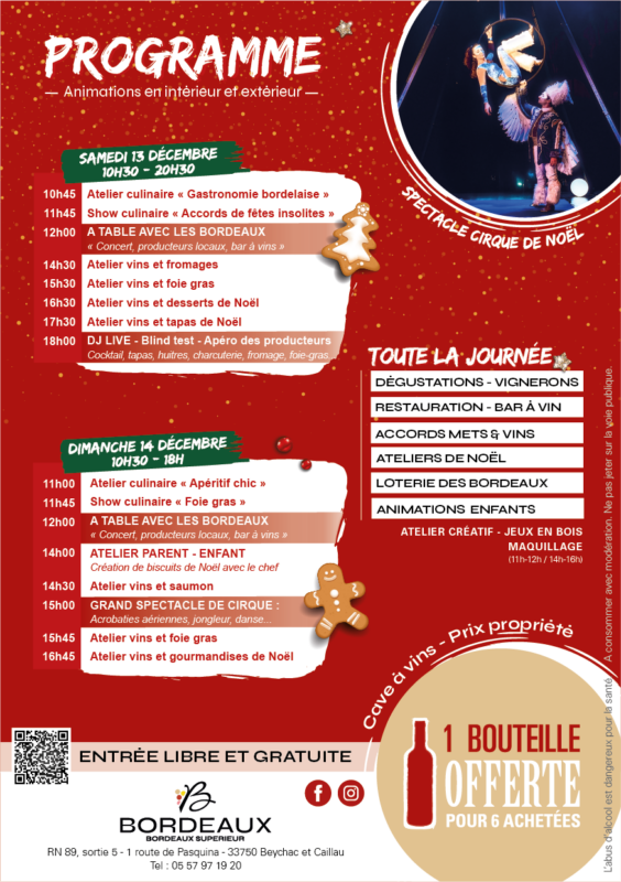 Marché de Noël des Bordeaux 2025 Date : samedi 13 décembre - dimanche 14 décembre Heure : Toute la journée Cet événement vous intéresse ? partagez-le : Nos autres événements Programme T.U.G. lundi 1 septembre - samedi 31 janvier Agenda médiathèque Novembre-Décembre samedi 1 novembre - jeudi 4 décembre Le marché de Noël dimanche 30 novembre Lir'àtoutboud'chou mercredi 3 décembre Atelier Linogravure mercredi 3 décembre Marché de Noël des Bordeaux 2025 samedi 13 décembre - dimanche 14 décembre Sortie familles samedi 13 décembre